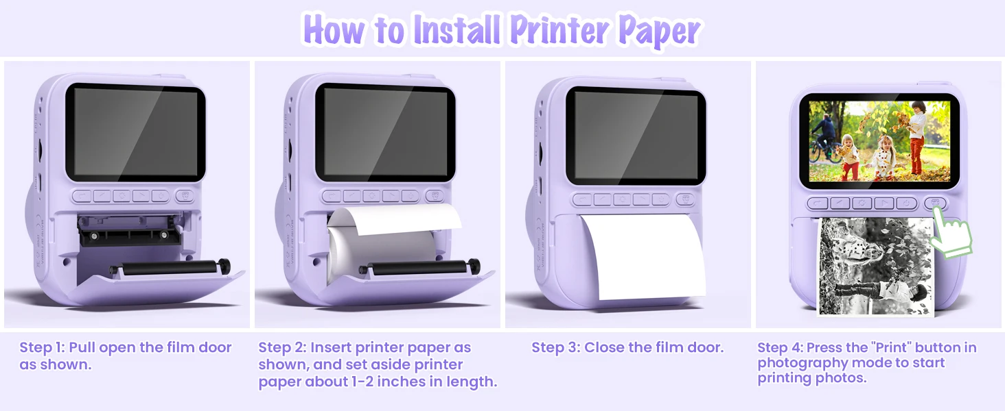【Zero Ink Instant Print & Instant Fun】This kids instant camera has a 3.0 inch large screen and uses inkless thermal printing technology to let kids get their black and white photos in seconds. We also provide 3 rolls of printer paper for kids to print. You can switch between "Print" mode and "Photo Taking" mode by pressing the "Print" button.
